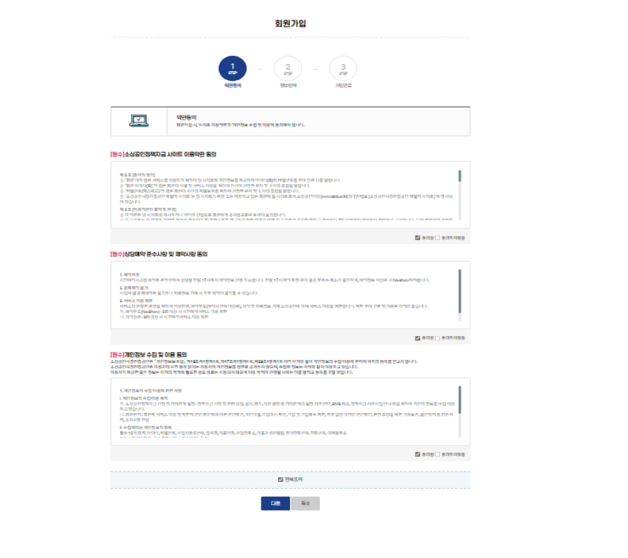 사이트 이용약관과 개인정보 수집 및 이용에 모두 동의하셔야 다음단계로 진행될 수 있습니다.