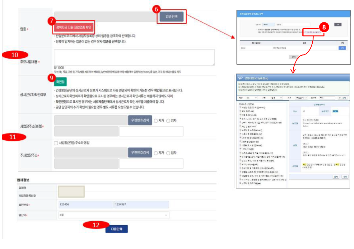 업종선택을 눌러 업종을 선택하는데 여기서 꼭 정확히 일치하는 업종을 선택안하셔도 됩니다. 없을시에는 유사 업종을 선택해서 다음으로 넘어가주세요