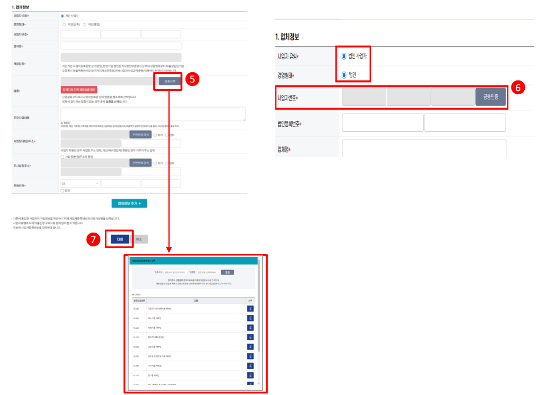 개인사업자는 사업자 번호를 직접 입력 후 업종선택 버튼을 눌러 업종을 선택하고 법인사업자는 사업자번호 공동 인증을 통해 사업자 번호를 입력 한 후에 업종을 선택합니다 필수 정보를 모두 입력한 후에는 버튼을 눌러 회원가입을 완료합니다.