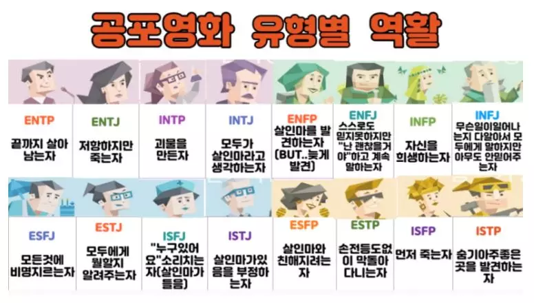 마지막으로 나는 어떤 사람인지 공포영화를 볼때 어떻게 행동하는지를 알 수 있는 짤로 마무리를 지을려고합니다 다들 MBTI 무료 검사도 진행해보고 더 나아가 정식검사도 진행을 해본 사람들은 이번짤을 보고 나는 이렇게 행동했었나? 생각해보면서 보시면 재밌게 보실 수 있을거 같습니다