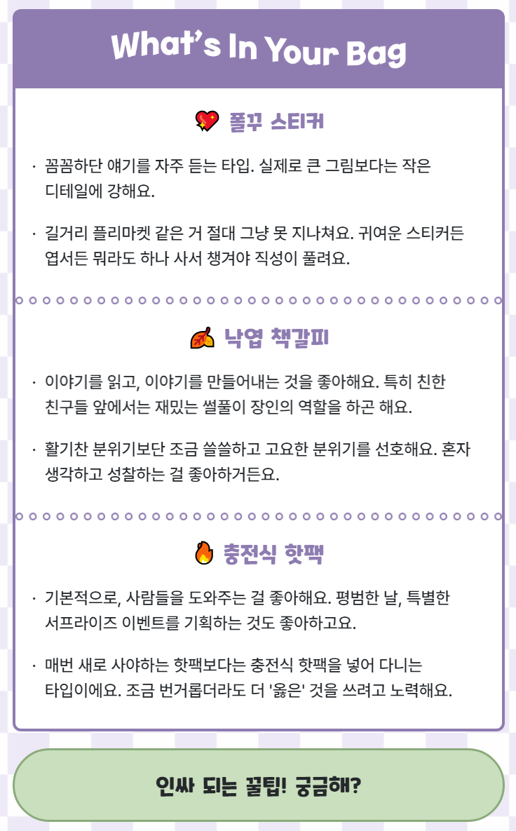 NBTI테스트를 하기전에 이렇게 귀여운 캐릭터가 우리를 반겨주는데요 바로 저 아래에 있는 내 인싸템 찾으러 가기를 눌러주면 NBTI테스트가 시작이 됩니다!